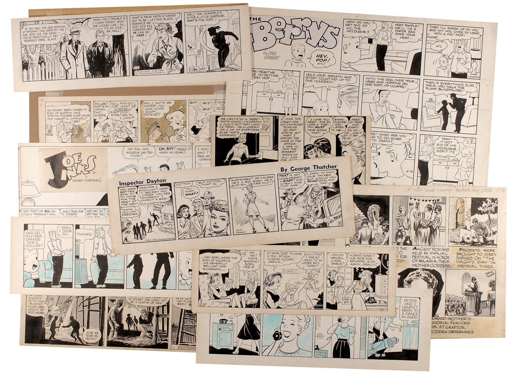 Twelve original hand-inked multi-panel daily comic strips, eleven signed, on off-white pieces of artist cardstock, ranging in size from 19.25 x 6 to 23 x 16. Artists are: Carl Grubert (3), John Forte, Henry Formhals, Carl Ed (3), Jack Kamen, George Scarbo, Warren Tufts, and Raeburn van Buren. In overall very good to fine condition with creasing, toning, soiling, and editorial notations. RRAuction COA.