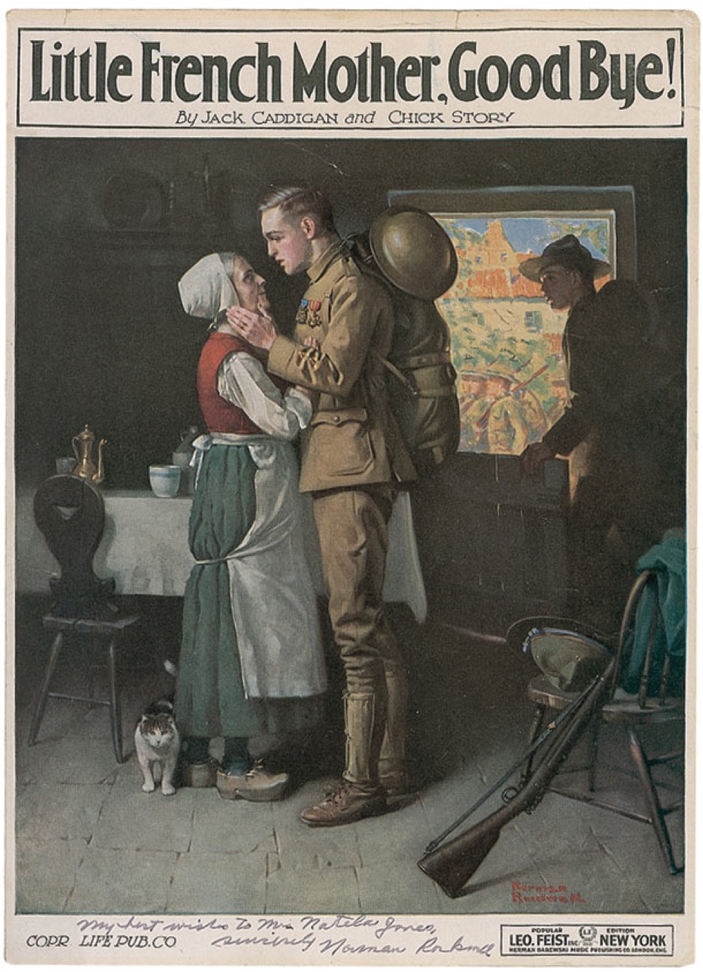 Sheet music to ‘Little French Mother, Good Bye!,’ 8 x 11, two pages, dated 1919 and featuring a Rockwell image on the cover, signed and inscribed at the bottom of the front cover, “My best wishes to Mrs. Natela Jones, sincerely, Norman Rockwell.” Scattered edge wear and creases, otherwise fine condition. RRAuction COA.