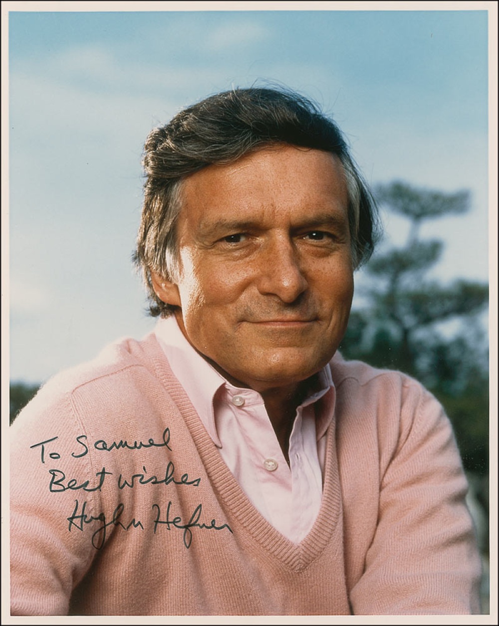 Color 8 x 10 cardstock photo, signed and inscribed in black felt tip “To Samuel, best wishes, Hugh Hefner.” In fine condition. RRAuction COA.