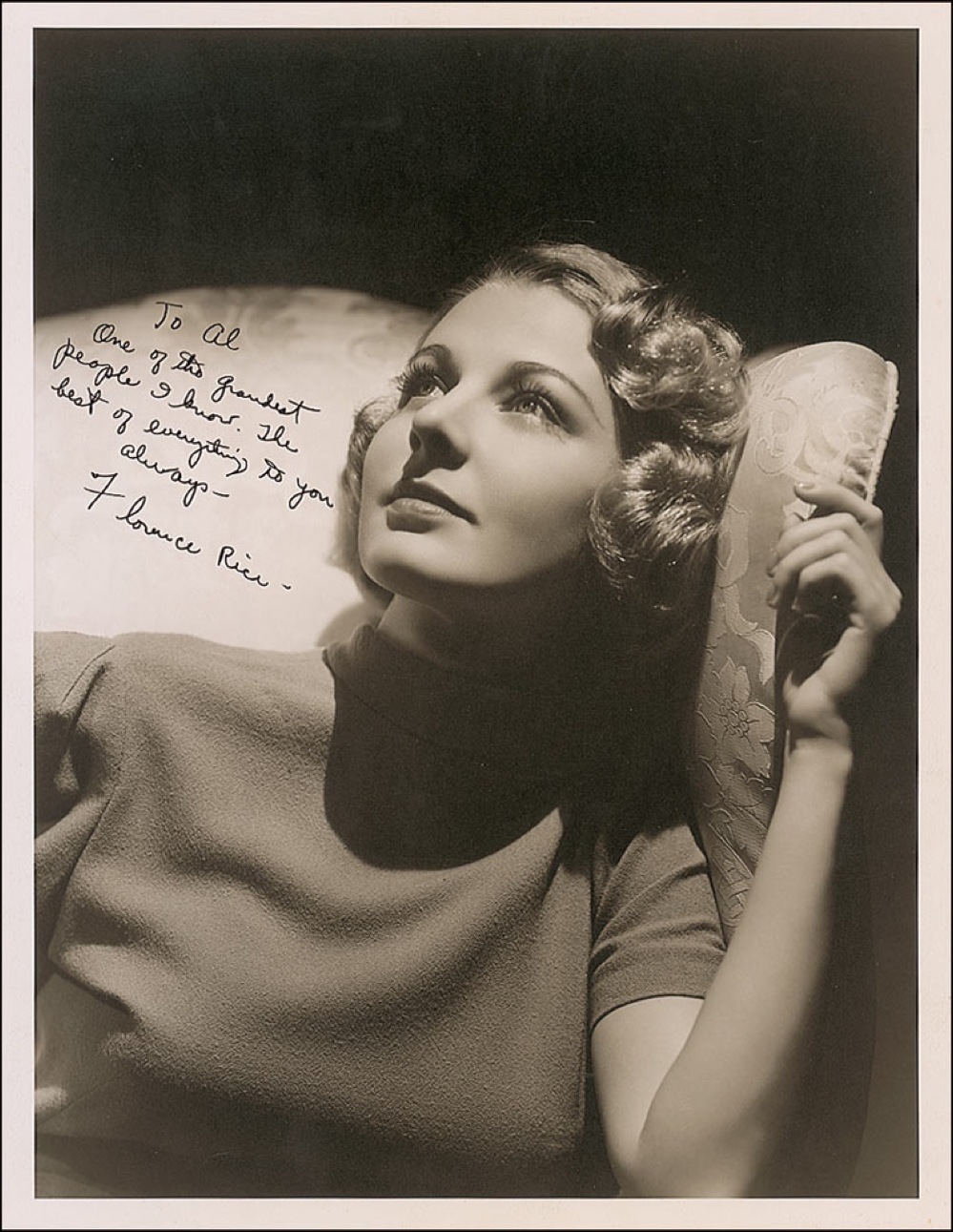 Beautiful vintage matte-finish 10 x 13 MGM publicity photo credited to Clarence Bull, signed and inscribed, “To Al, One of the grandest people I know. The best of everything to you always–Florence Rice.” In fine condition. Pre-certified PSA/DNA and RR Auction COA.
