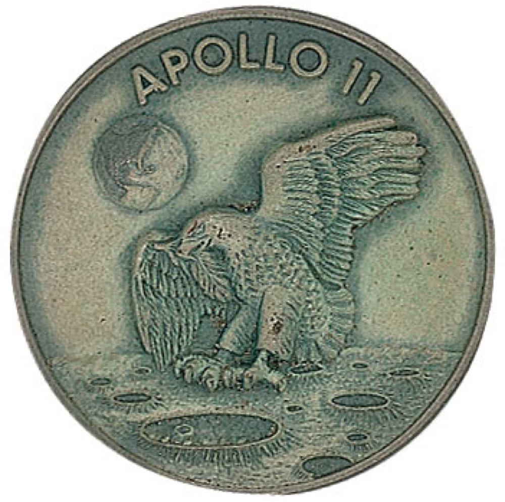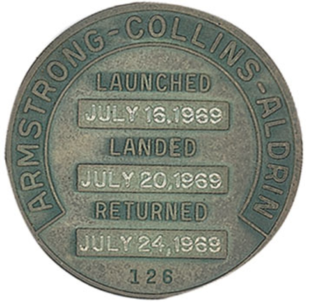 Historic flight-flown Apollo 11 Robbins Medal, approximately 1.25 diameter, with a raised design on the face of the iconic Apollo 11 mission insignia. The reverse of the sterling silver medal is engraved with the last names of astronauts Neil Armstrong, Buzz Aldrin, and Michael Collins, along with the July 16, 1969, launch date, July 20, 1969, moon landing date, and July 24, 1969, return date. This medal is serial numbered “126.” Normal condition. This item originated from the collection of Buzz Aldrin and was first sold in 1990 by Superior Galleries.