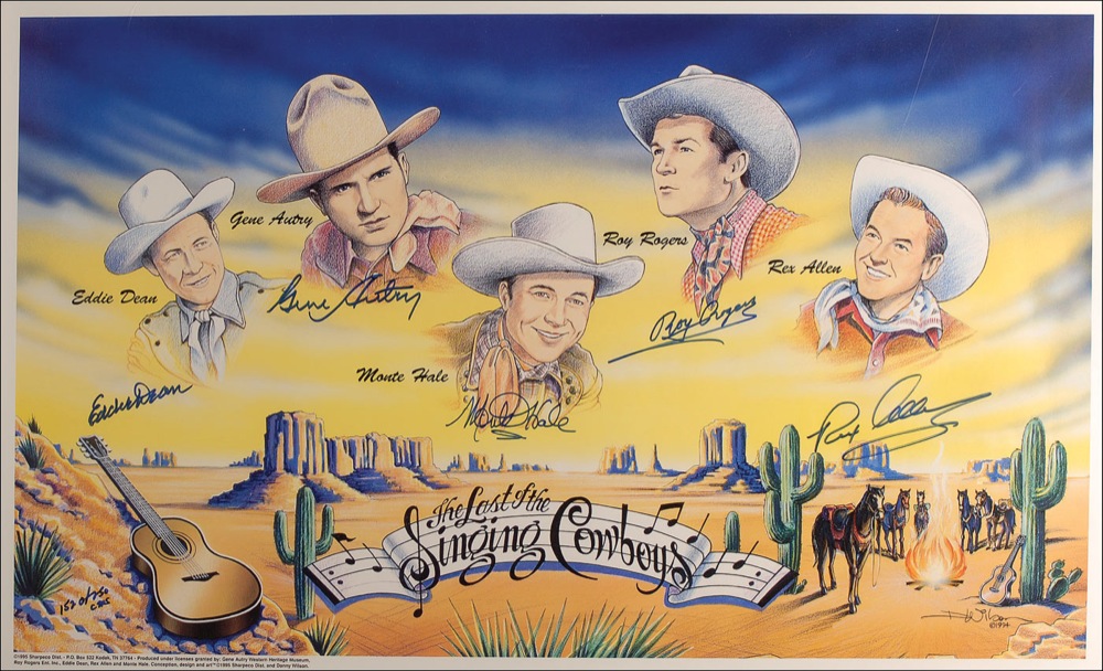 Color limited edition 29 x 17 print entitled ‘The Last of the Singing Cowboys,” numbered #152/250,’ signed in blue felt tip by all five pictured: Gene Autry, Roy Rogers, Eddie Dean, Monte Hale, and Rex Allen. Rolled and in fine condition. Pre-certified PSA/DNA and RR Auction COA.