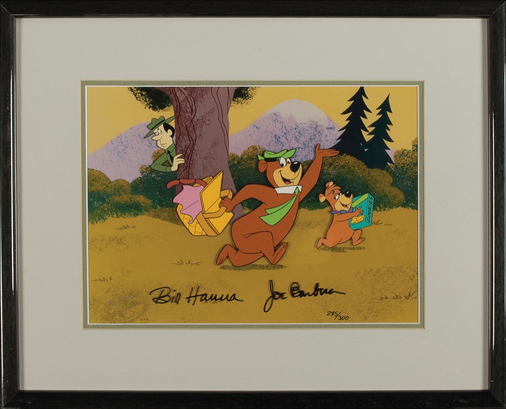 Limited edition hand-painted animation cel, 11.5 x 8.75, showing Yogi and Boo Boo getting away with a picnic basket, #285/300, signed in black felt tip by Bill Hanna and Joe Barbera. Set against a pre-printed color background and double matted and framed to an overall size of 18 x 15. In fine condition. RRAuction COA.