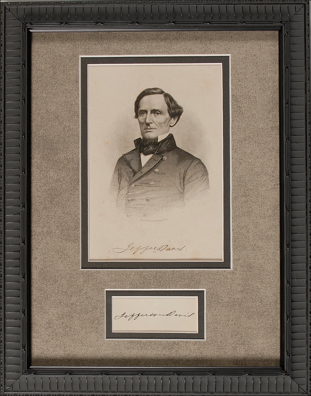 American military officer and politician (1808–1889) who, after serving as a senator and US secretary of war, was the first and only president of the Confederacy, from 1861 until its collapse at the end of the Civil War. Exceptionally crisp and bold ink signature, “Jefferson Davis,” on an off-white 3.25 x 2 card. Archivally double cloth matted and framed with an engraved book portrait to an overall size of 11 x 14. In fine condition. Pre-certified PSA/DNA and RR Auction COA.