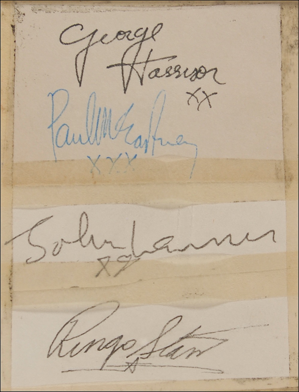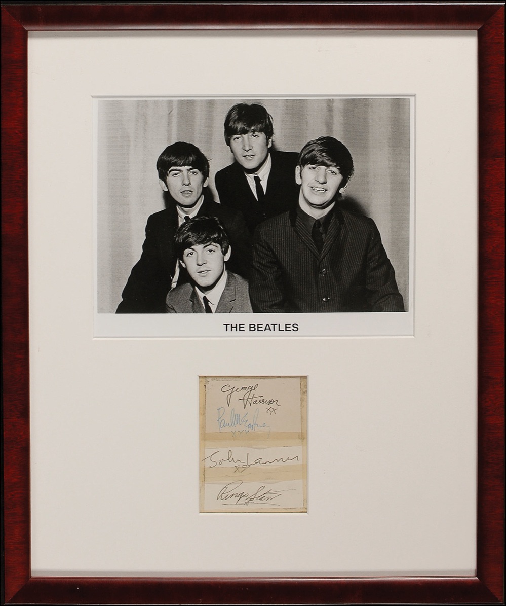 Vintage ink and ballpoint signatures, “George Harrison xx,” “Paul McCartney xxx,” “John Lennon xx,” and “Ringo Starr,” on three off-white slips taped together to an overall size of 3.25 x 4.25. Matted and framed with a portrait of the Fab Four, to an overall size of 15.25 x 18.5. In very good condition, with two horizontal pieces of tape connecting slips, with tape over small portions of Lennon and McCartney’s signatures, tape around edges, a bit of light soiling, and two small vertical creases through a single letter of Lennon’s signature. Accompanied by a certificate of authenticity from Perry Cox. Pre-certified Roger Epperson/REAL and RR Auction COA.