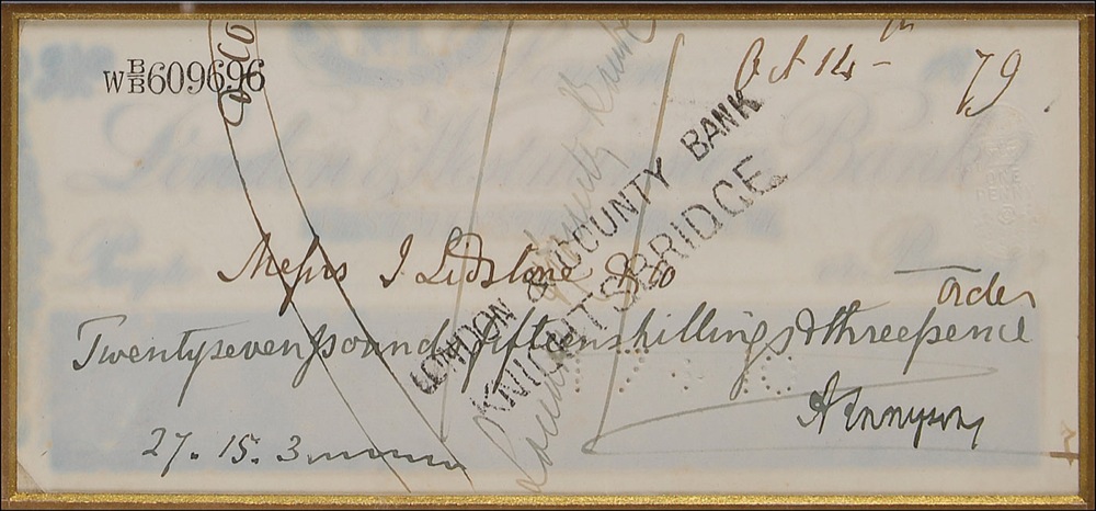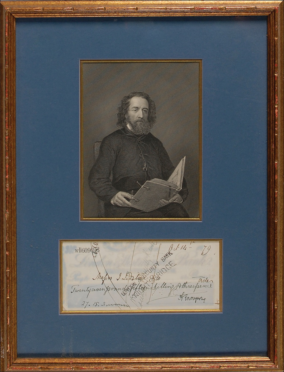 Distinguished British poet (1809–1892) who was one of the most highly regarded and influential literary figures of the Victorian era. Bank check, 7 x 3, filled out in another hand and signed by Tennyson, payable to Messrs. J. Lidstone & Co. for £27.15.3, October 14, 1879. Double matted and framed with an engraved portrait to an overall size of 12.5 x 17. Cancellation holes and signature to check body, and light overall fading to printed portions of signature, most likely from moisture exposure, but not affecting the bold signature, otherwise fine condition. RRAuction COA.