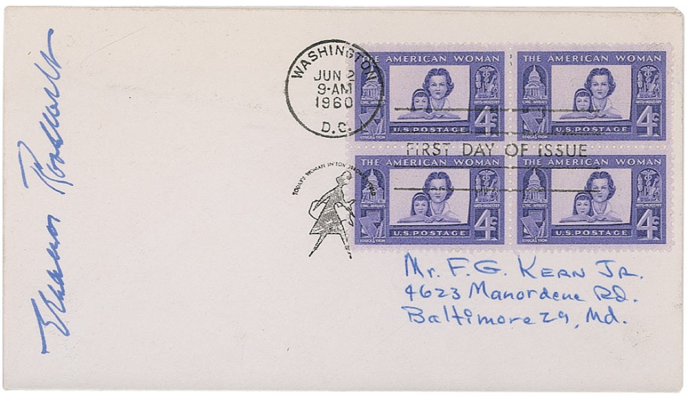 FDC with a small stamped cachet honoring Today’s Woman in Tomorrow’s World, signed vertically in blue ink along the left edge. In fine condition. RRAuction COA.