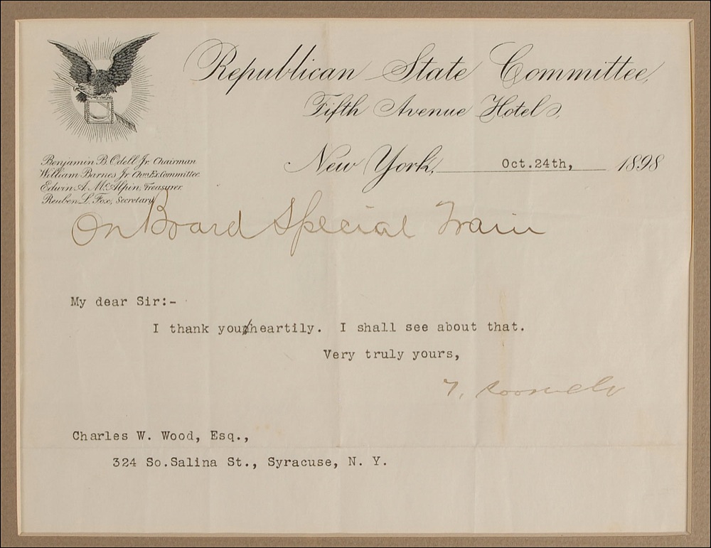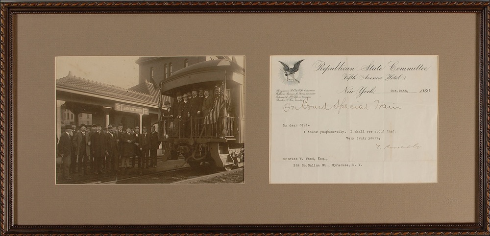 TLS signed “T. Roosevelt,” one page, 8.25 x 6.25, Republican State Committee letterhead, October 24, 1898. Brief letter to Charles W. Wood. In full: “I thank you heartily. I shall see about that.” Written at the top of the letter in an unknown hand is “On Board Special Train.” Matted and framed with a photo of Roosevelt and his staff posing on the caboose of a train to an overall size of 24 x 11.5. In very good condition, with intersecting folds, one through a single letter of signature, and scattered light toning and foxing. Pre-certified John Reznikoff/PSA/DNA and RR Auction COA.
