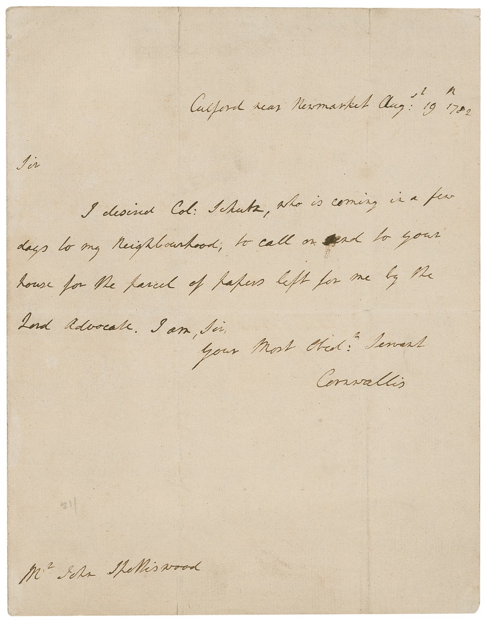 English general (1738–1805) who fought against Washington during the American Revolution and was finally defeated at Yorktown. The crushing defeat aroused much antiwar sentiment in England, and hostilities thereafter tapered off until the final withdrawal of British troops in 1783. ALS signed “Cornwallis,” one page, 7.25 x 9.5, August 19, 1782. Letter to a gentleman. In full: “I desired Col. Schutz, who is coming in a few days to my neighbourhood, to call or send to your house for the parcel of papers left for me by the Lord Advocate.” Intersecting folds, one through a single letter of signature, scattered soiling, and a uniform shade of mild toning, otherwise fine condition. RRAuction COA.