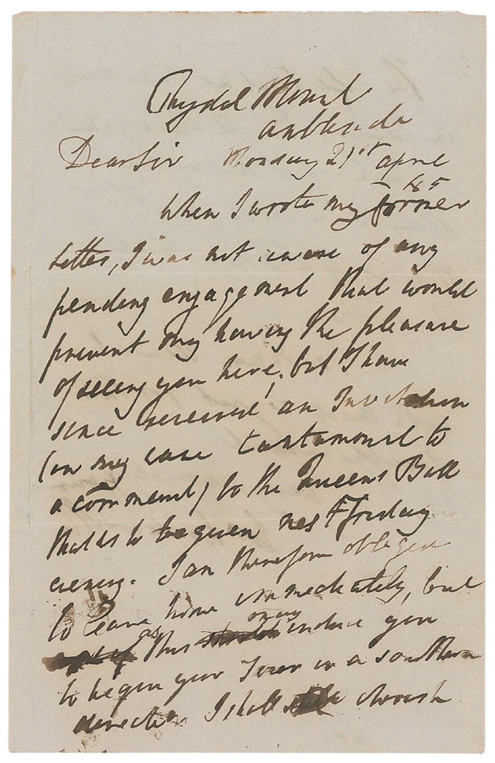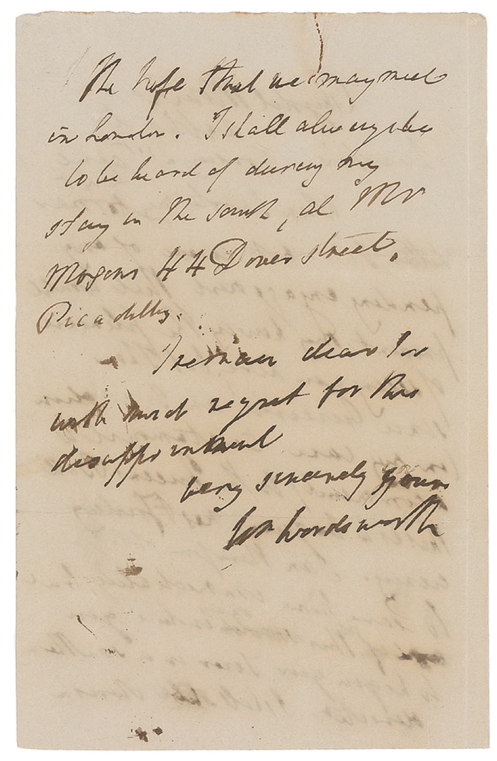 English poet and author (1770–1850) of ‘Lyrical Ballads,’ a collection inspired by the beauty of the English Lake District. ALS signed “Wm. Wordsworth,” one page both sides, 5 x 8, April 21, 1845. Letter to an unidentified gentleman. In part: “When I wrote my former letter, I was not aware of any pending engagement that would prevent my having the pleasure of seeing you here, but I have since received an invitation (in my case tantamount to a command) to the Queen’s Ball that is to be given Friday evening. I am therefore obliged to leave home immediately, but as this may induce you to begin your tour in a southern direction, I shall cherish the hope that we may meet in London.” In very good condition, with uniform toning, show-through from writing on reverse, rusty paperclip mark to top edge, and several ink blotches to text, not affecting legibility. RRAuction COA.