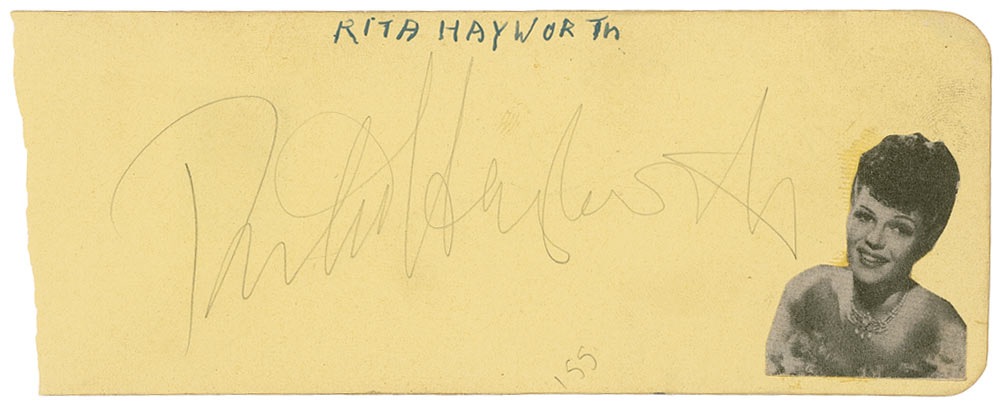 Vintage pencil signature, “Rita Hayworth,” on a yellow 5.5 x 2 album page, with a small clipped photo affixed to right side and collector’s notation along top. In fine condition, with some scattered light soiling, small fingerprint, and signature a shade light. Pre-certified PSA/DNA and RR Auction COA.