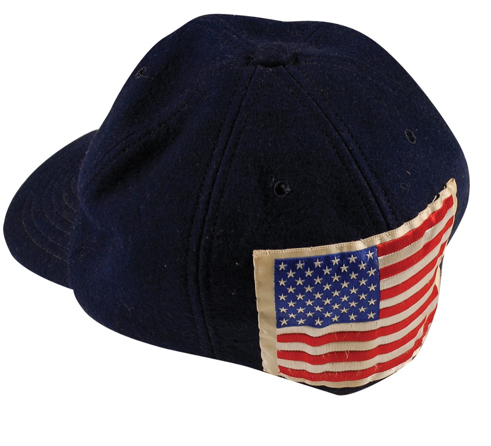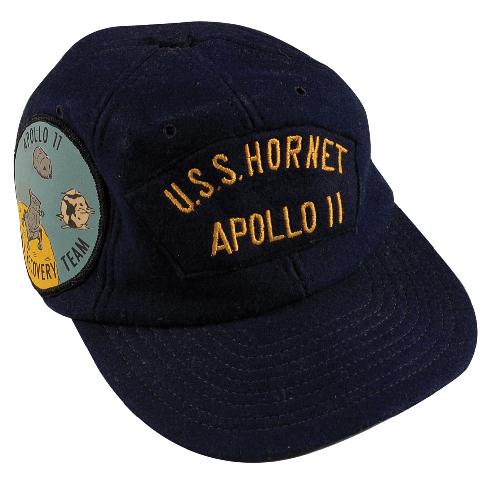 Apollo 11 USS Hornet TV Recovery Team cap. Blue wool cap by Harvard Sports Headwear is embroidered “U.S.S. Hornet, Apollo 11,” with a recovery team patch affixed to one side and embroidered American flag on the back of the cap. In fine condition, with normal wear. RRAuction COA.