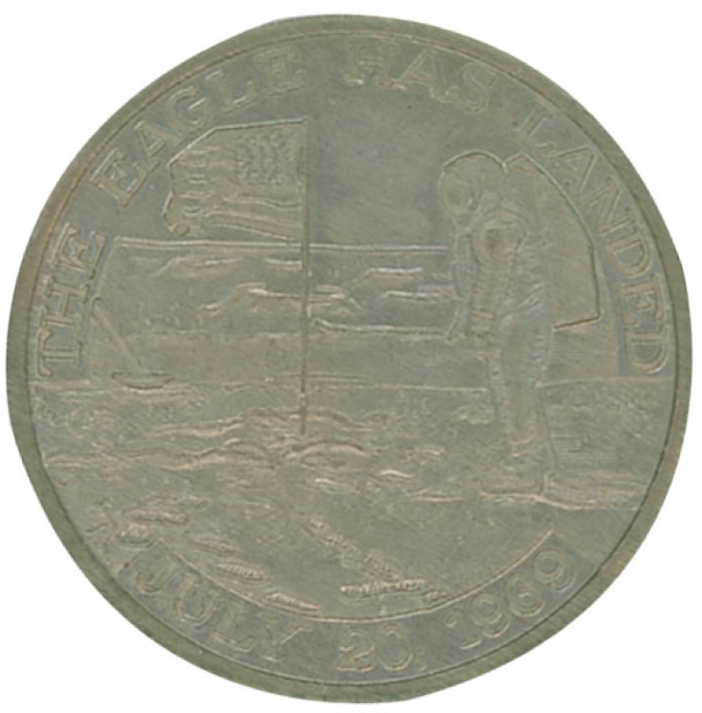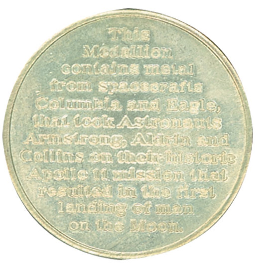 Apollo 11 Manned Flight Awareness medal, 1.25″ diameter. The face bears the raised re-creation of the famous image of Buzz Aldrin looking at the American flag on the lunar surface; the reverse is engraved, “This Medallion contains metal from spacecrafts Columbia and Eagle, that took Astronauts Armstrong, Aldrin and Collins on their historic Apollo 11 mission that resulted in the first landing of man on the Moon.” Normal condition, with light overall finish loss. A desirable artifact commemorating—and made from—a piece of history! RRAuction COA.