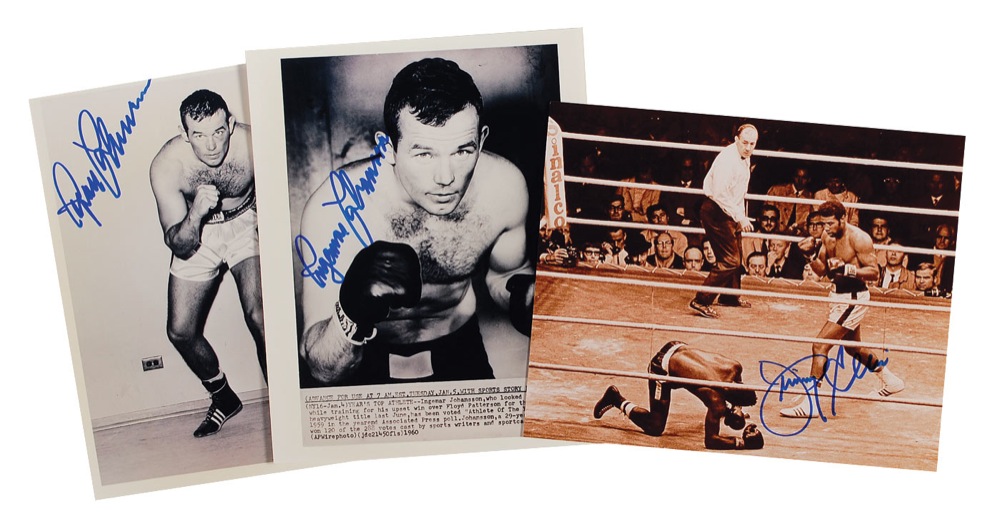 Three glossy photos, two 8 x 10 boxing poses signed in blue felt tip by Ingemar Johansson, and a 10 x 8 ring shot signed in blue felt tip by Jimmy Ellis. In overall fine condition. RRAuction COA.