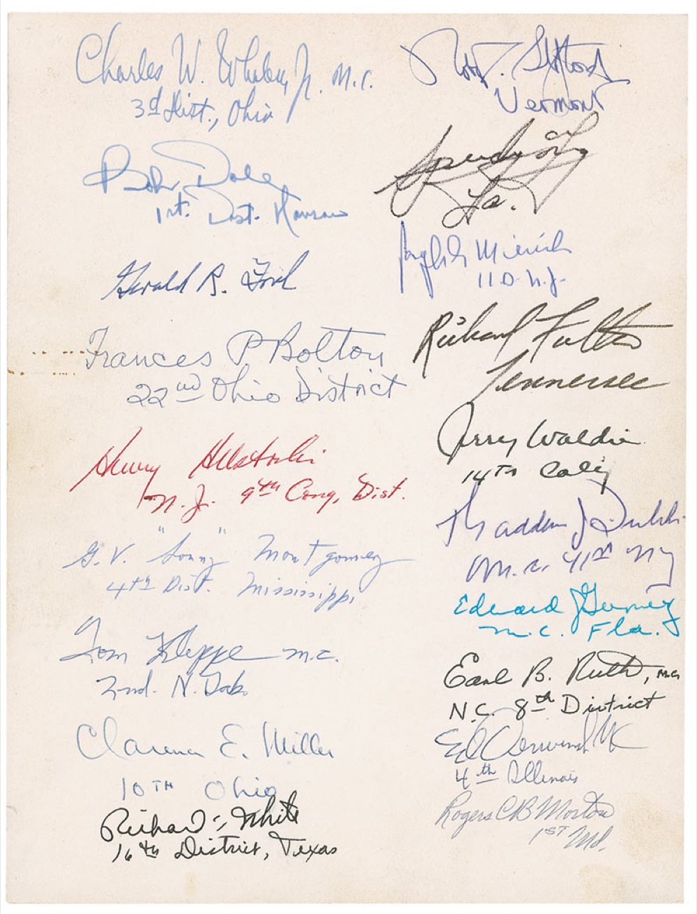 Nineteen ink signatures of members of the United States Congress on an 8 x 10.5 sheet. All of the elected officials served on Capitol Hill in the late 1960s. Signers include: Gerald Ford, Bob Dole, Frances P. Bolton, Ed Derwinski, Thaddeus J. Dulski, Richard Fulton, Edward Gurney, Henry Helstoski, Tom Kleppe, Clarence Miller, Sonny Montgomery, Rogers C. B. Morton, Earl Ruth, Robert T. Stafford, Jerry Waldie, Charles W. Whalen, Jr., Richard White, and two others. Scattered creasing, soiling, and a rusty paperclip impression at the left side touching the start of Bolton’s name, otherwise fine condition. RRAuction COA.