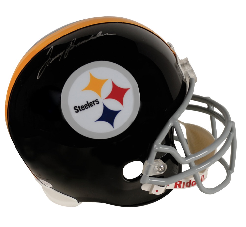 Official Riddell replica Pittsburgh Steelers football helmet signed in silver ink on the side. In fine condition. Accompanied by a certificate of authenticity from James Spence. Pre-certified Steve Grad/PSA/DNA and RR Auction COA.