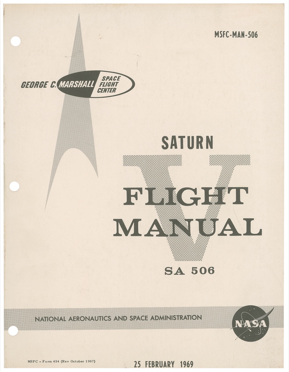 Bound operations manual titled “Saturn V Flight Manual SA 506,” dated February 25, 1969. Manual measures 8.25 x 10.75. An opening page states in part, “This manual was prepared to provide the astronaut with a single source reference as to the characteristics and functions of the SA-506 launch vehicle and AS-506 flight mission.” Manual is full of flow charts, check lists, and procedures for various states as well as emergency detection, performance, instrumentation, and mission variables. In fine condition. RRAuction COA.
