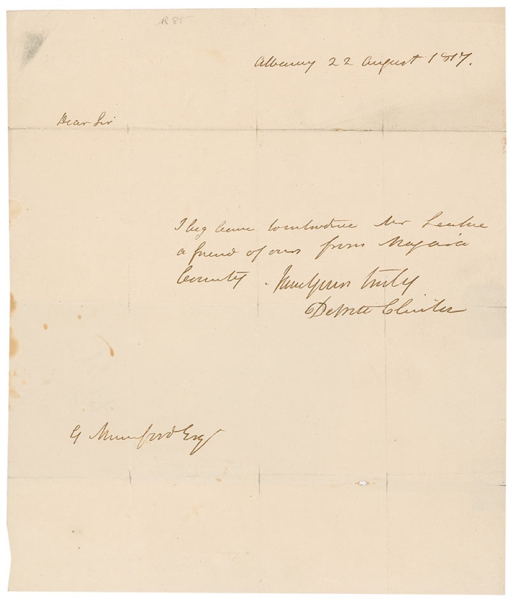 American politician (1769-1828) who served as senator and who, as governor of New York, played a major role in the construction of the Erie Canal. ALS, one page, 8 x 9.25, August 22, 1817. Brief letter of introduction to G. Mumford, Esq. In full: “I beg leave to introduce Mr. Leahie a friend of ours from Nassau County.” In very good condition, with partial separations along intersecting folds, with two folds passing through signature, and scattered light toning, foxing, and soiling. RRAuction COA.