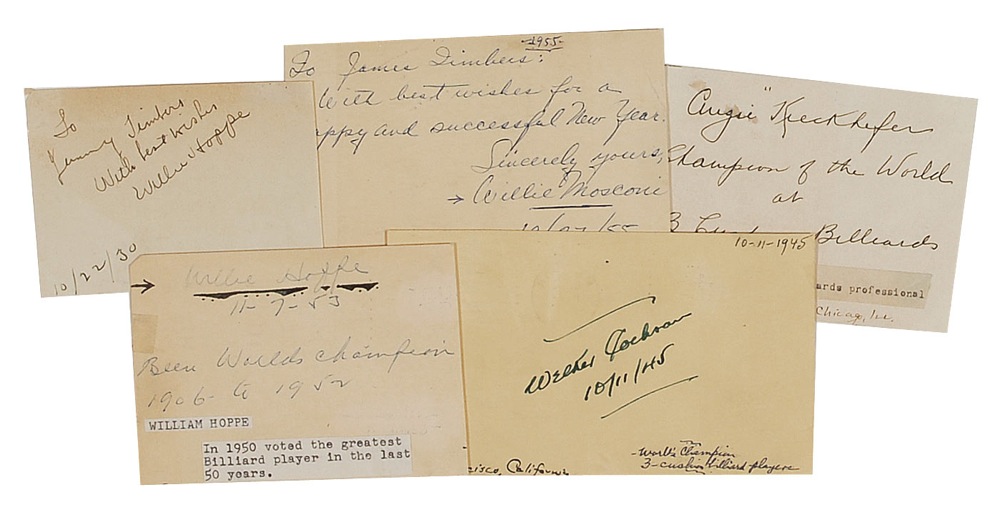 Five items consisting of signatures on various size cards and government postcards, each signed by a former billiard great. Signers are: Willie Mosconi, Willie Hoppe (2), Augie Kieckhefer, and Welcker Cochrane. In very good condition, with various scattered toning and mounting remnants to many of the corners. RRAuction COA.