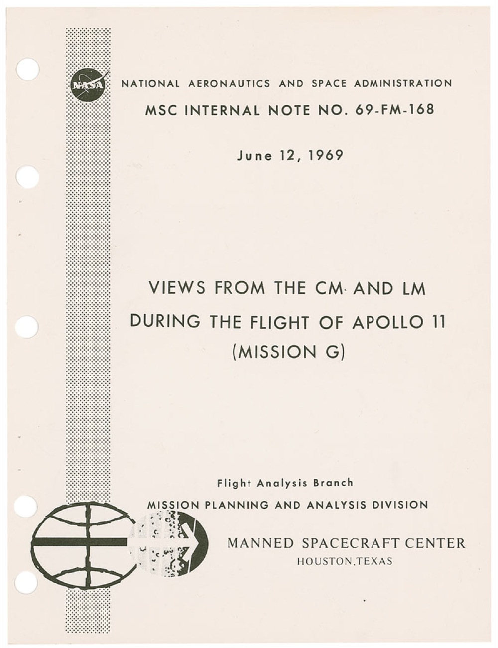 Original unbound printed manual entitled “Views From the CM and LM During The Flight Of Apollo 11 (Mission G),” dated June 12, 1969. Manual contains 267 pages, most of which are exact depictions in the form of illustrations, showing what the Apollo 11 astronauts will see out their windows at any time during the mission. Some of the section headings include Discussion of Data, Mission Geometry, Views From CSM During Translunar Phase, Views From CSM and LM During Lunar Orbit Phase, Views From CSM During Transearth Phase, and Views From CM During Entry Phase. RRAuction COA.