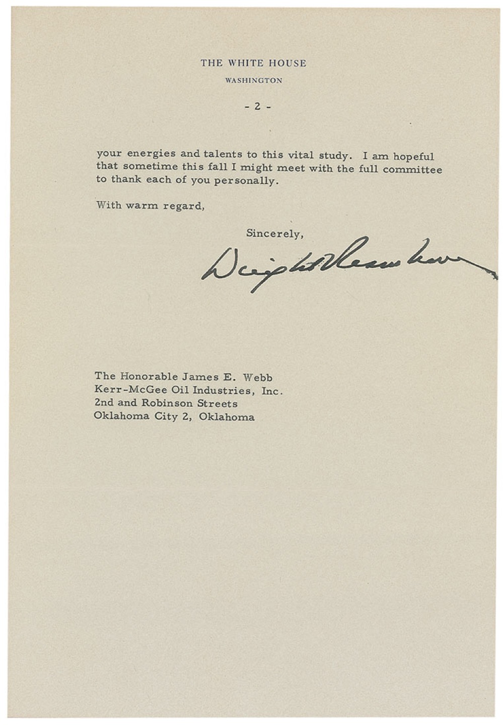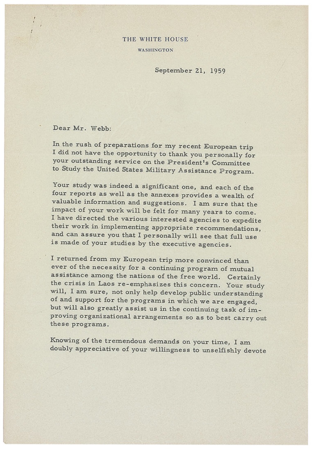 TLS as president, two pages, 7 x 10.25, White House letterhead, September 21, 1959. Letter to James E. Webb at Kerr-McGee Oil Industries. In full: “In the rush of preparations for my recent European trip I did not have the opportunity to thank you personally for your outstanding service on the President’s Committee to Study the United States Military Assistance Program. Your study was indeed a significant one, and each of the four reports as well as the annexes provides a wealth of valuable information and suggestions. I am sure that the impact of your work will be felt for many years to come. I have directed the various interested agencies to expedite their work in implementing appropriate recommendations, and can assure you that I personally will see that full use is made of your studies by the executive agencies.