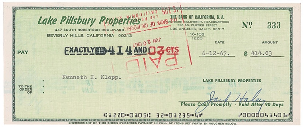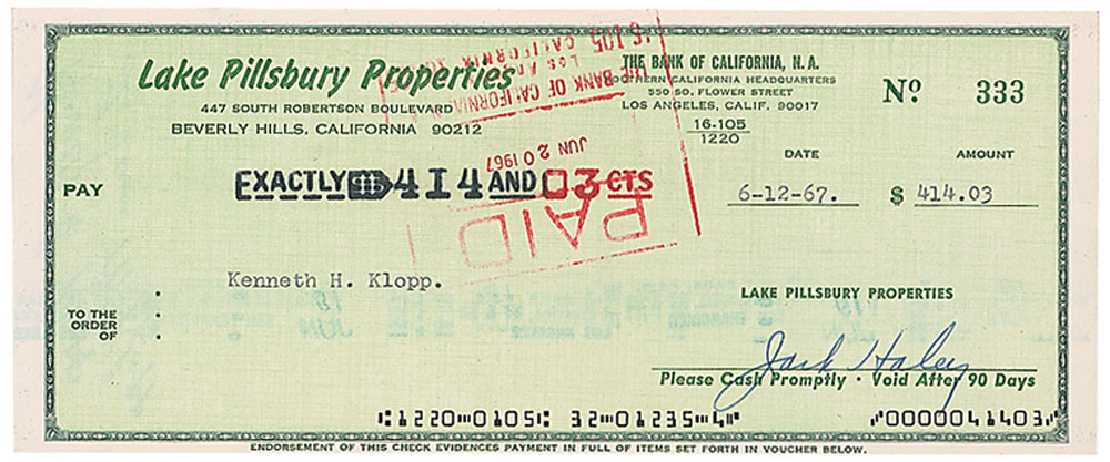 Business check, 8.5 x 3.5, filled out in type and signed by Haley, payable to Kenneth H. Klopp for $414.03, June 12, 1967. In fine condition, with expected cancellation stamp. Pre-certified PSA/DNA and RR Auction COA.
