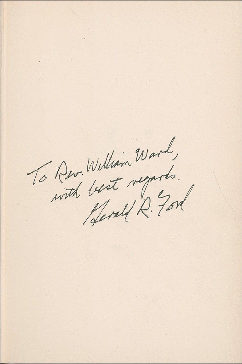Signed book: Portrait of the Assassin. First edition, first printing. NY: Simon & Schuster, 1965. Hardcover with dustjacket, 6 x 8.75, 508 pages. Signed and inscribed in black felt tip on the first free end page, “To Rev. William Ward, with best regards, Gerald R. Ford.” Mild surface rubbing to the front cover, scattered surface dings and impressions to the back cover, and trivial paper loss to the top and bottom of the spine, otherwise fine condition. RRAuction COA.