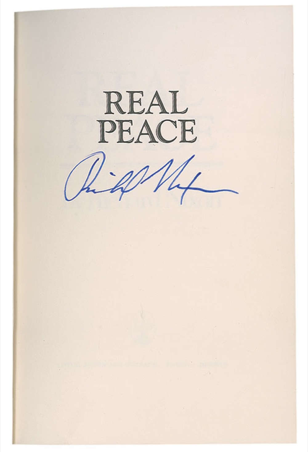 Signed book: Real Peace. First edition, later printing. Boston: Little, Brown and Company, 1984. Hardcover with dustjacket, 6 x 8.5, 107 pages. Signed on the half- title page in blue felt tip, “Richard Nixon.” In fine condition, with light scattered surface dings to the cover. Pre-certified John Reznikoff/PSA/DNA and RR Auction COA.