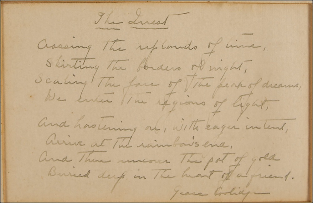 Scarce AQS on an off-white 5 x 3.25 sheet, signed at the conclusion, “Grace Coolidge.” Coolidge pens her poem, “The Quest.” In full, “Crossing the uplands of time, Skirting the borders of night, Scaling the face of the peak of dreams, We enter regions of light, And hastening on, with eager intent, Arrive at the rainbow’s end, And there uncover the pot of gold, Buried deep in the heart of a friend.” Matted and framed to an overall size of 8 x 6. Mild shade of toning and a few spots of soiling, otherwise fine condition. An uncommon and desirable example of her light-hearted 1930 literary contribution. Pre-certified John Reznikoff/PSA/DNA and RR Auction COA.