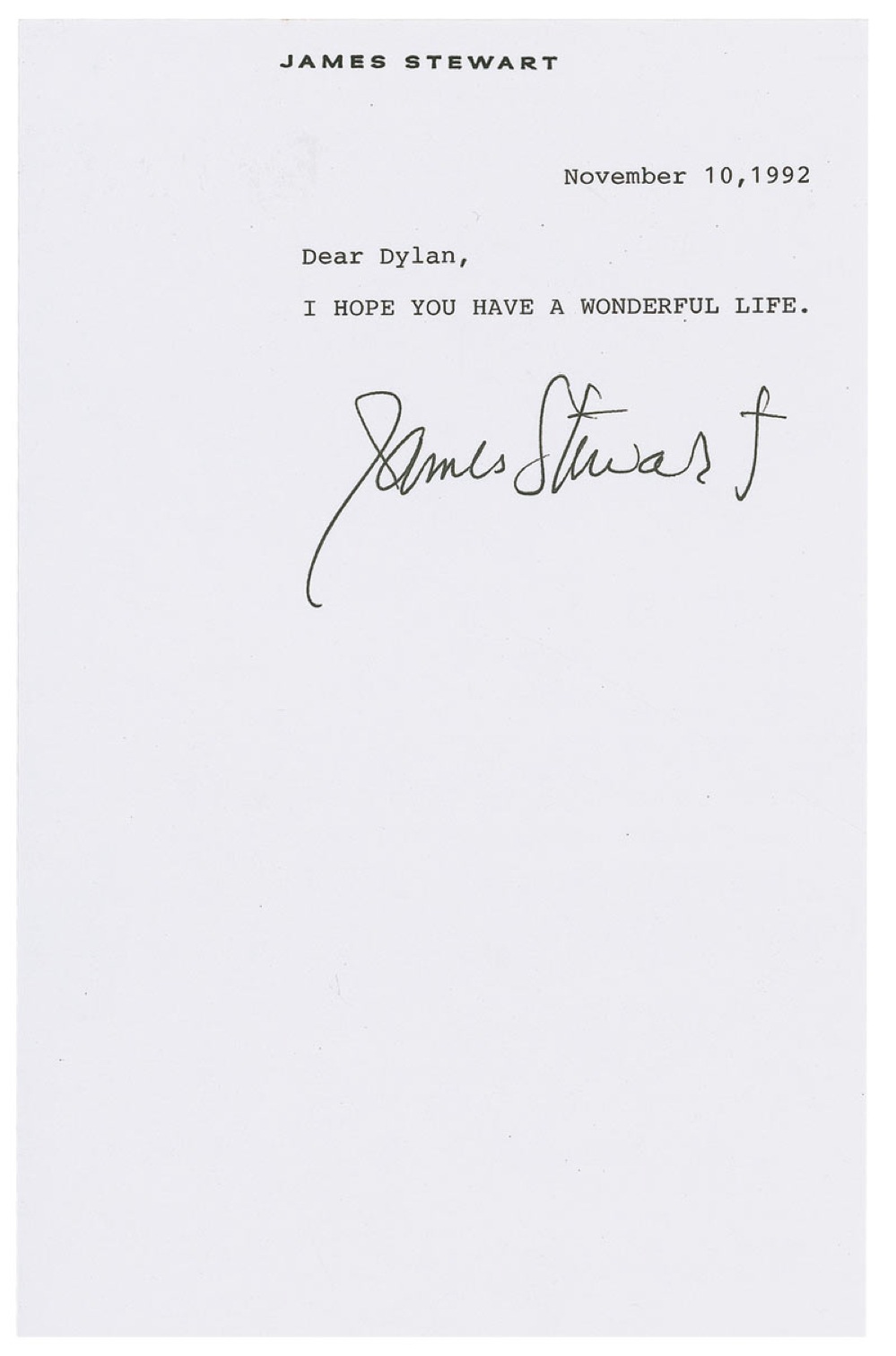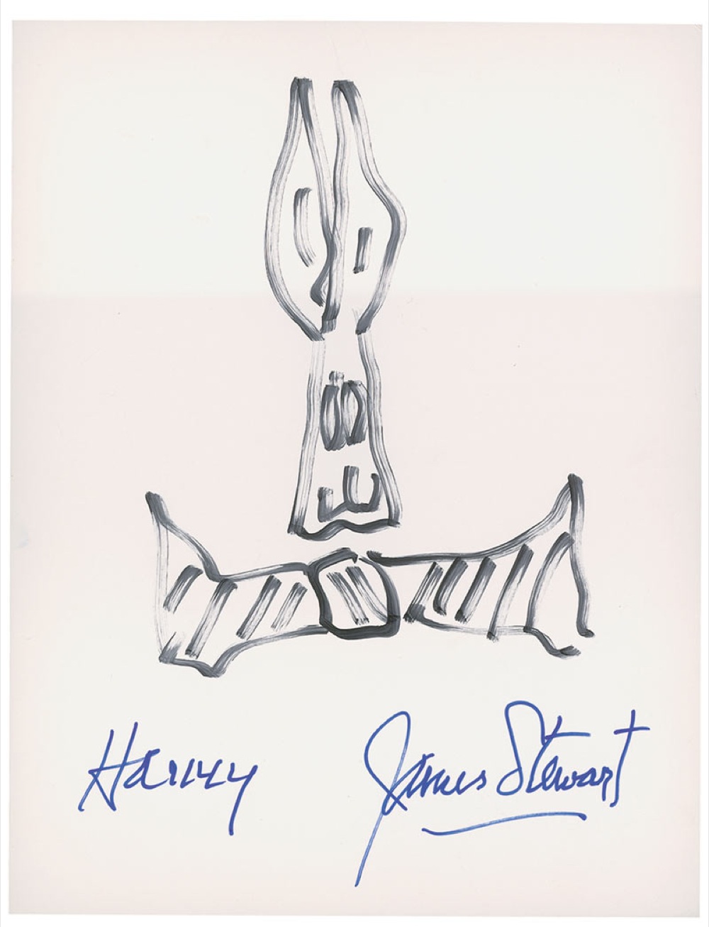 Two items: original felt tip sketch of Harvey the Rabbit on an off-white 8.5 x 11 card, signed “James Stewart,” and “Harvey”; and a TLS, one page, 5.5 x 8.5, personal letterhead, dated November 10, 1992. In full: “I hope you have a wonderful life.” In overall fine condition. RRAuction COA.