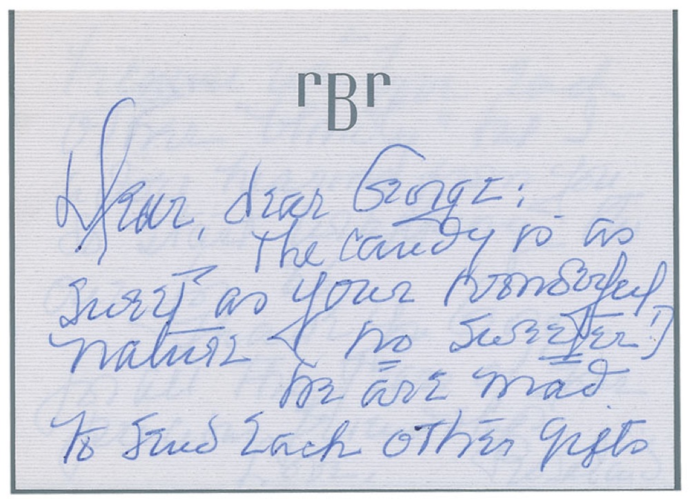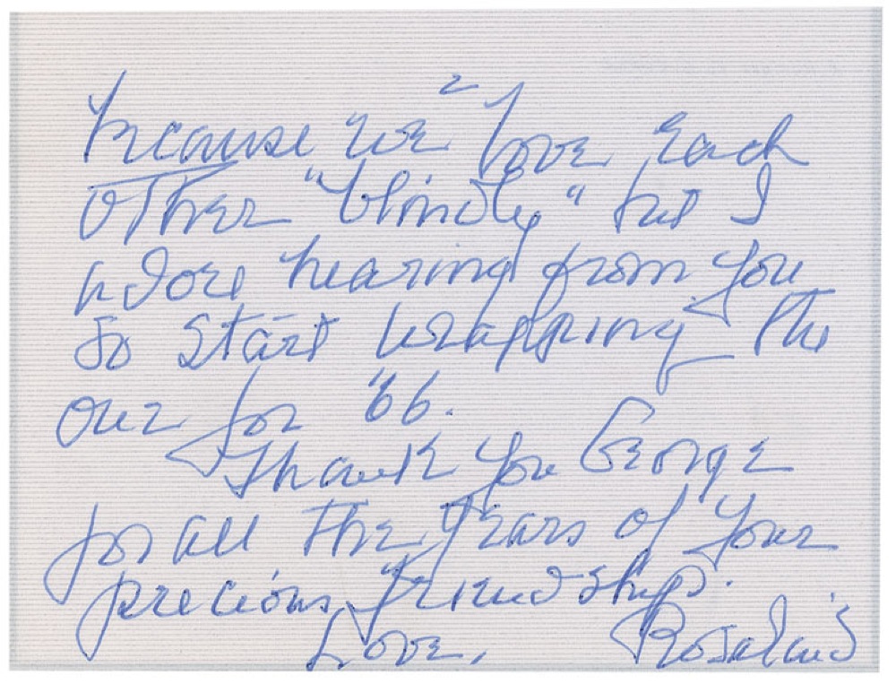 ALS signed “Rosalind,” two pages on a folded 5 x 3.5 personal note sheet, no date. Russell writes “Dear, dear George.” In full: “The candy is as sweet as your wonderful nature (no sweeter!). We are mad to send each other gifts because we love each other ‘blindly’ but I adore hearing from you so start wrapping the one for ‘66.” In fine condition. Pre-certified PSA/DNA and RR Auction COA.