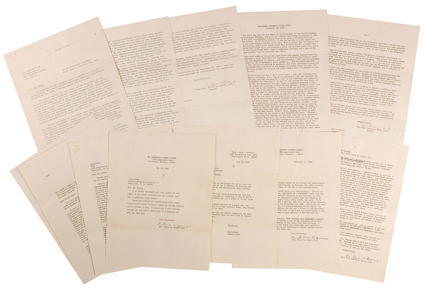 Another two page signed statement, entitled “President Kennedy’s Final Hours,” reads, in part: “During these ceremonies, Mrs. Kennedy was standing beside the President. She and others in the emergency room answered the prayers with which they were familiar. Mrs. Kennedy bent over and seemed to kiss the President…During this most trying ordeal, the perfect composure maintained by Mrs. Kennedy was beyond comprehension. I will never forget the blank stare in her eyes and the signs of agony on her face. I extended my heartfelt sympathy and that of my parishioners to her. In a low tone of voice she thanked me graciously and asked me to pray for the President.”