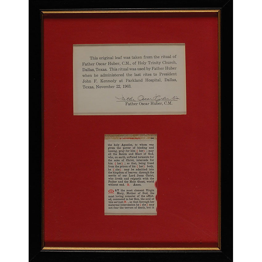 The priest who administered the last rites to John F. Kennedy. Original Last Rites leaf, 2.5 x 4, used by Father Oscar Huber when he administered the last rites to President John F. Kennedy at Parkland Hospital on November 22, 1963. Page reads, in part: “May the most clement Virgin Mary, Mother of God, loving consoler of the afflicted, commend to her Son, the soul of this Servant…so that through her maternal intercession he (she) may not fear the terrors of death.” Accompanied by a signed statement of provenance from Huber stating, “This original leaf was taken from the ritual of Father Oscar Huber, C.M., of Holy Trinity Church, Dallas, Texas. This ritual was used by Father Huber when he administered the last rites to President John F. Kennedy at Parkland Hospital, Dallas, Texas, November 22, 1963.” Both are matted and framed to an overall size of 10 x 13. In fine condition, with a thin line of toning along top edge of leaf. Also accompanied by a 1967 transmittal letter from Huber presenting the leaf. RRAuction COA.