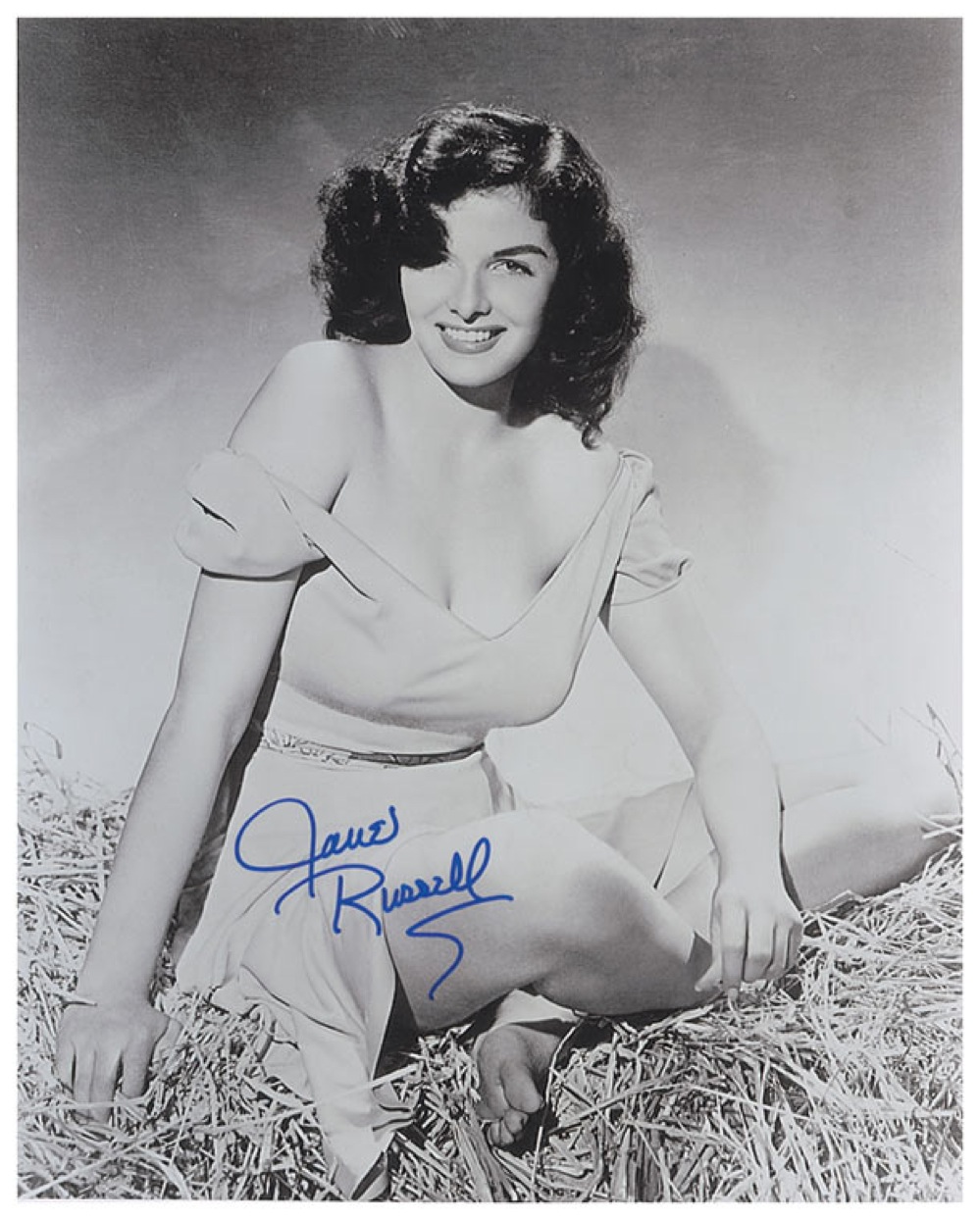 Seductive glossy 10 x 12.5 photo of a bare-shouldered Russell seated on a bale of hay, signed in blue felt tip. In very fine condition. Pre-certified PSA/DNA and RR Auction COA.