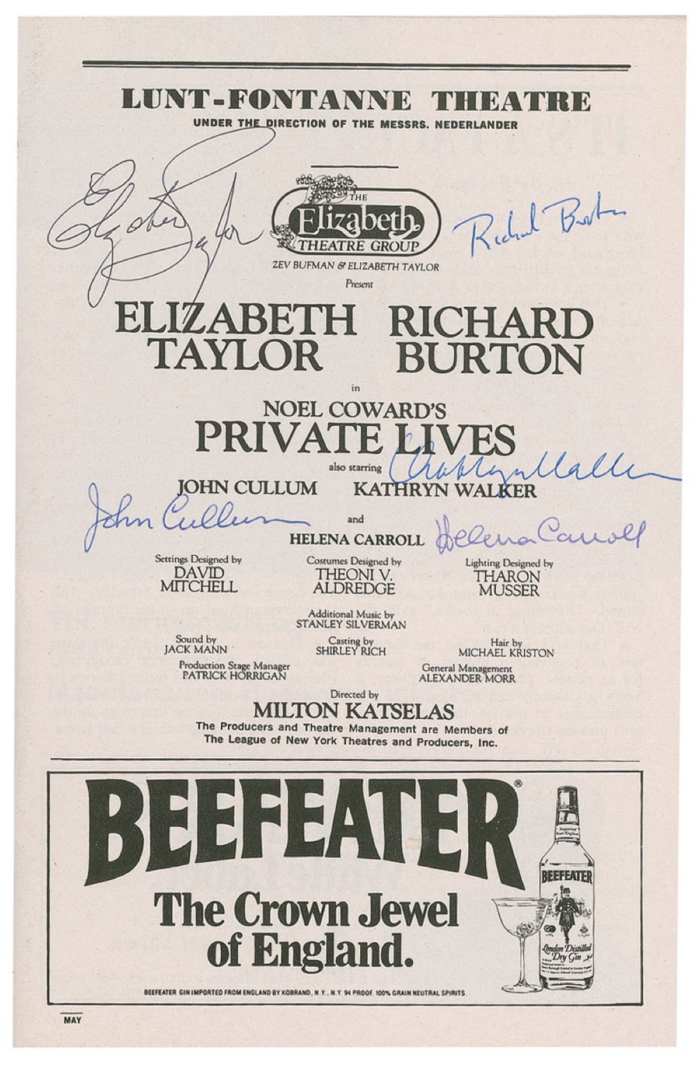 Playbill from a Lunt-Fontanne Theatre 1983 presentation of Private Lives, 5.5 x 8.5, 82 pages, signed on page 37 by Taylor in black ballpoint, and by Burton in blue ballpoint, and by John Cullum, Helena Carroll, and Kathryn Walker. In fine condition. Pre-certified PSA/DNA and RR Auction COA.