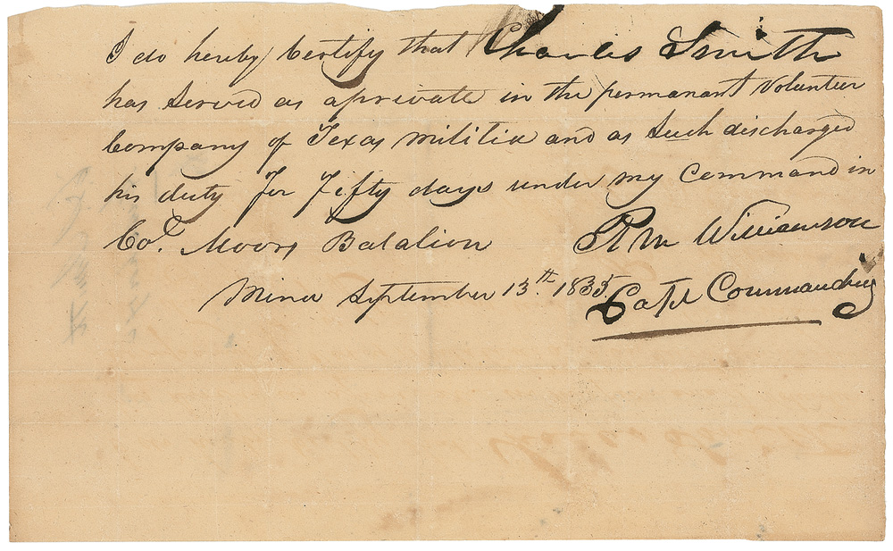Manuscript DS, signed “R. M. Williamson, Capt. Commanding,” one page, 7.5 x 4.5, September 13, 1835. Certification reads, in full: “I do hereby certify that Charles Smith [Smith’s name filled in by Williamson] has served as a private in the permanent volunteer company of the Texas militia and as such discharged his duty for Fifty days under my command in Col. Moors Batalion [sic].” Boldly signed at the conclusion by Williamson. In fine condition, with intersecting folds, a couple lightly affecting signature, mild toning and foxing, and some light mirroring of ink to bottom portion of sheet. Smith took part in the siege of Bexar, and re-enlisted in December of 1835 for an additional four months, perishing at the Alamo. The Robert Davis Collection. Pre-certified John Reznikoff/PSA/DNA and RR Auction COA.