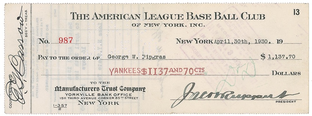 The American League Base Ball Club business check, 9 x 3.25, filled out in type and signed by Ruppert and countersigned by Ed Barrow, “E. G. Barrow,” payable to George W. Pipgras, who endorses the signature on the reverse, for $1,137.70, April 30, 1930. In very good condition, with two vertical creases, one lightly affecting Rupert’s signature, scattered light creasing, light toning, and expected cancellation stamps and notes, the latter only lightly affecting Rupert’s signature. Pre-certified Steve Grad/PSA/DNA and RR Auction COA.