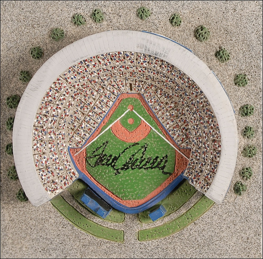 Limited edition ceramic mini-model of Shea Stadium, #986/4750, signed on the playing field area in blue felt tip by Seaver. In fine condition, with light skipping to signature due to nature of surface. Pre-certified Steve Grad/PSA/DNA and RR Auction COA.