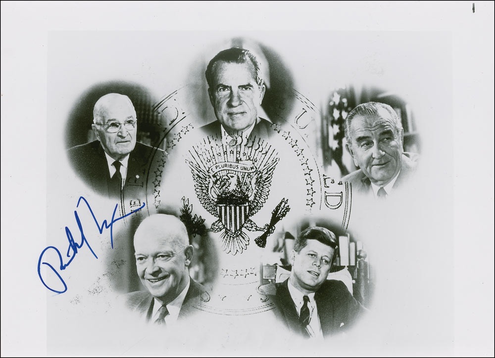 Glossy 10 x 8 composite photo featuring President’s Nixon, Johnson, Kennedy, Eisenhower, and Truman, signed in blue felt tip by Nixon. In fine condition, with a few trivial creases. Pre-certified John Reznikoff/PSA/DNA and RR Auction COA.