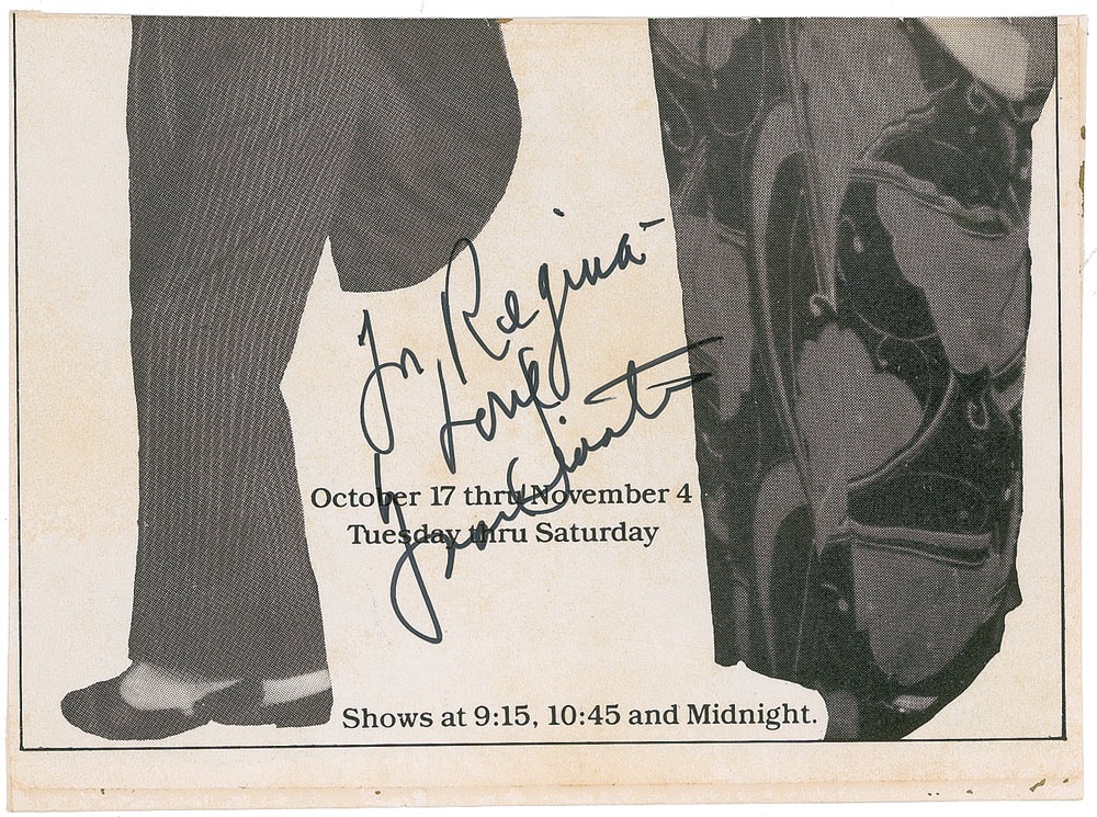 Fountain pen signature and inscription, “For Regina—Love, Frank Sinatra,” on a 5.25 x 4 page removed from a show program. In very good condition, with scattered toning and soiling, some affecting the signature. Pre-certified PSA/DNA and RR Auction COA.