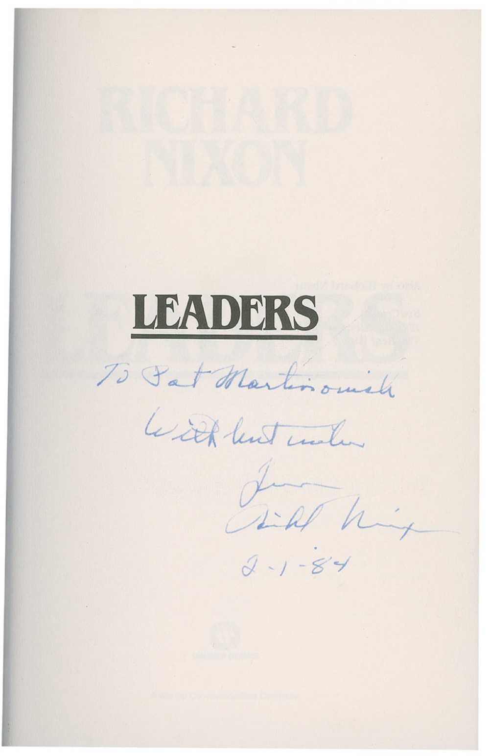 Signed book: Leaders. First edition, first printing. NY: Warner Books, 1982. Hardcover with dustjacket, 6.25 x 9.25, 371 pages. Signed and inscribed on the half-title page, “To Pat Martinovish, with best wishes from Richard Nixon 2-1-84.” In fine condition, with a few pencil marks to fore-edge and some scattered light toning and creasing to dustjacket. Pre-certified John Reznikoff/PSA/DNA and RR Auction COA.