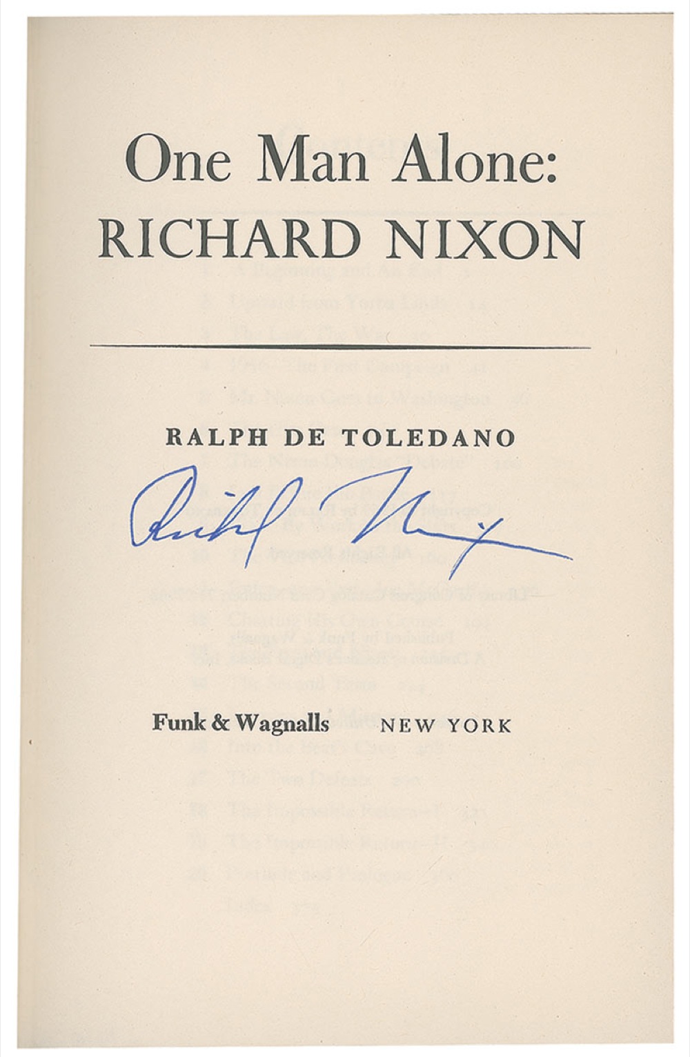 Signed book: One Man Alone. First edition. NY: Funk and Wagnalls, 1969. Hardcover with dustjacket, 5.5 x 8.5, 386 pages. Signed on the title page in blue ink. In fine condition, with dustjacket showing some scattered soiling, creasing, and a few tears. Pre-certified John Reznikoff/PSA/DNA and RR Auction COA.