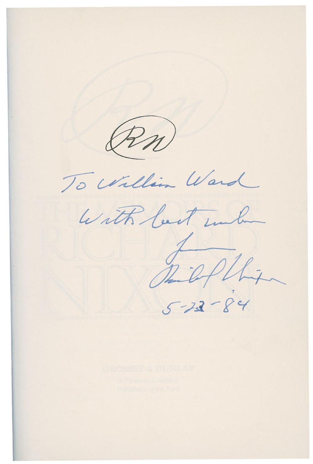 Signed book: The Memoirs of Richard Nixon. First edition, first printing. NY: Grosset and Dunlap, 1978. Hardcover with dustjacket, 6.75 x 9.5, 1120 pages. Signed and inscribed on the second free end page, “To William Ward, with best wishes from Richard Nixon 5-23-84.” In fine condition, with dustjacket showing scattered light wear, creases, and a few small tears. Pre-certified John Reznikoff/PSA/DNA and RR Auction COA.