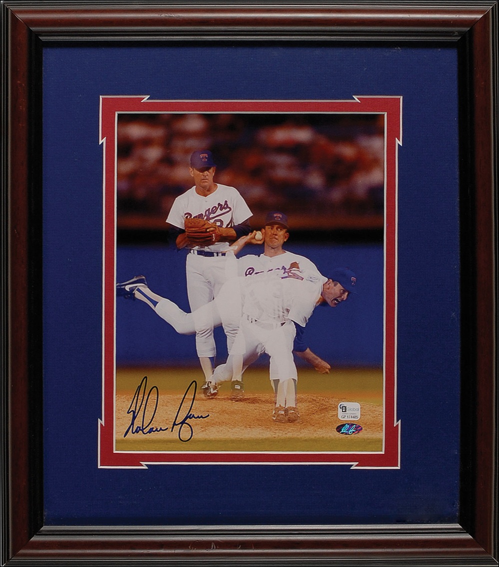 Color satin-finish 8 x 10 time-lapse photo of Ryan on the mound for the Texas Rangers, signed in blue felt tip. Double matted and framed to an overall size of 14 x 16. In very fine condition. Pre-certified Steve Grad/PSA/DNA and RR Auction COA.