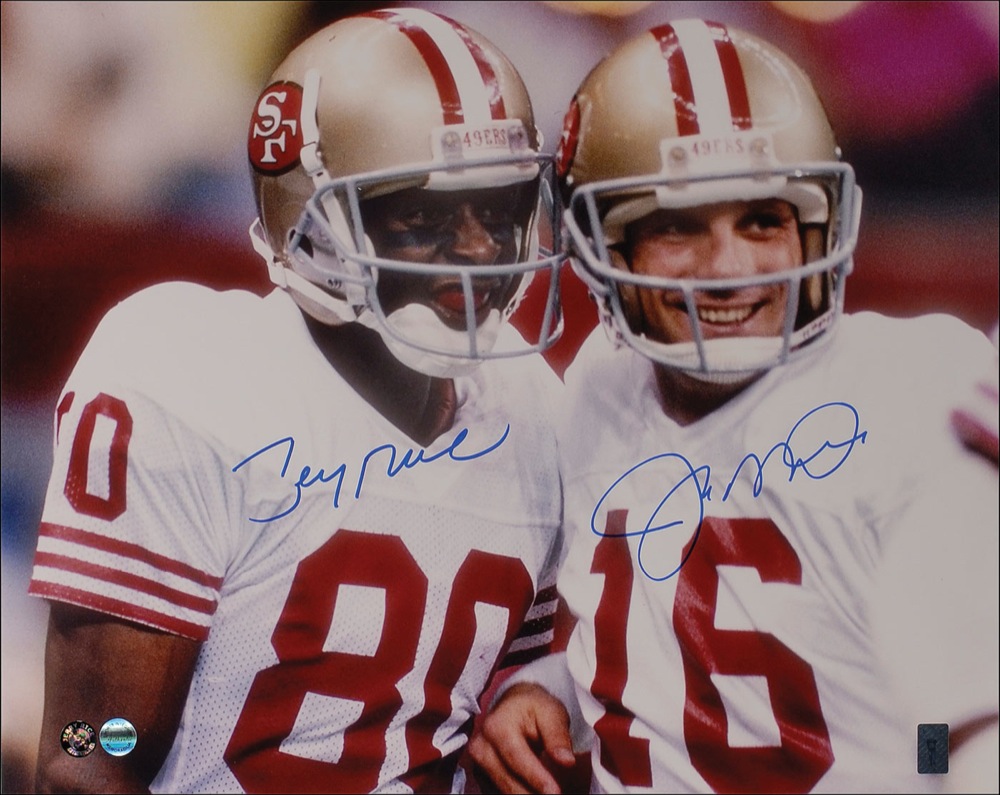 Color satin-finish 20 x 16 photo of Montana and Rice on the field for the 49ers, signed in blue felt tip by Joe Montana and Jerry Rice. In very fine condition. Pre-certified Steve Grad/PSA/DNA and RR Auction COA.