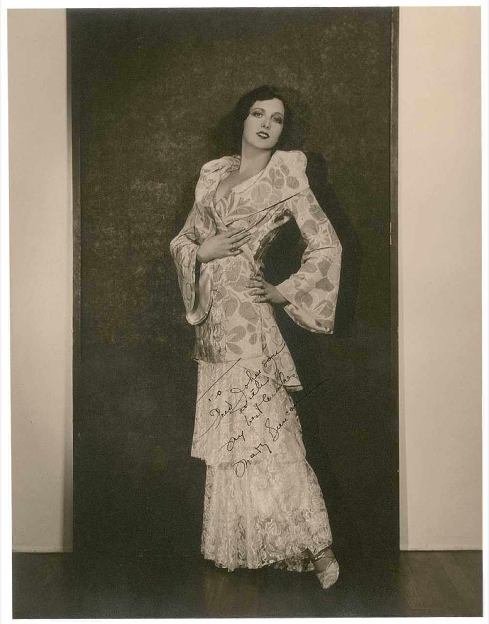 Gorgeous vintage sepia matte-finish 10.5 x 13.5 full-length Russell Ball photo, signed and inscribed in fountain pen, “To Fred Johnson, with only best wishes, Mary Duncan.” In fine condition, with mild areas of silvering, lightly trimmed edges, and light contrast to the end of the signature. Pre-certified PSA/DNA and RR Auction COA.