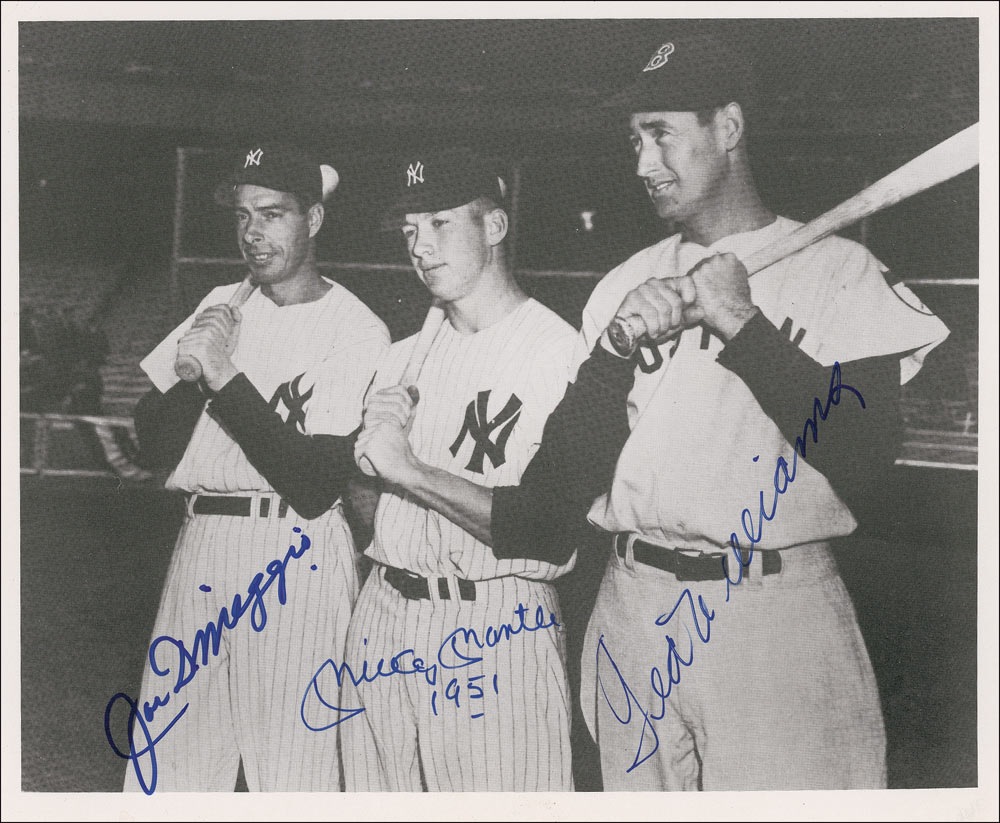 Timeless 10 x 8 cardstock photo of the legendary Yankees and Red Sox players, signed in blue felt tip, “Joe DiMaggio,” “Mickey Mantle, 1951,” and “Ted Williams.” In very fine condition. An exemplar addition to any baseball collection. Pre-certified Steve Grad/PSA/DNA and RR Auction COA.
