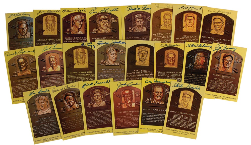 Twenty-two gold Hall of Fame plaque cards, each signed on the front in felt tip or ballpoint by the respective Hall of Famer pictured. Signers are: Lou Boudreau, Stanley Coveleski, Al Chandler, Jocko Conlon, Rick Ferrell, Burleigh A. Grimes, Lefty Gomez, Chas Gehringer, Billy Herman, Carl Hubbell, Travis Jackson, George Kell, Al Lopez, Bob Lemon, Buck Leonard, Richard Marquard, Edd Roush, Robin Roberts, Pee Wee Reese, Enos Slaughter, Warren Spahn, Joe Sewell, and Bill Terry. In fine condition, with some light brushing and light irregular ink adhesion to some of the signatures. RR Auction COA.