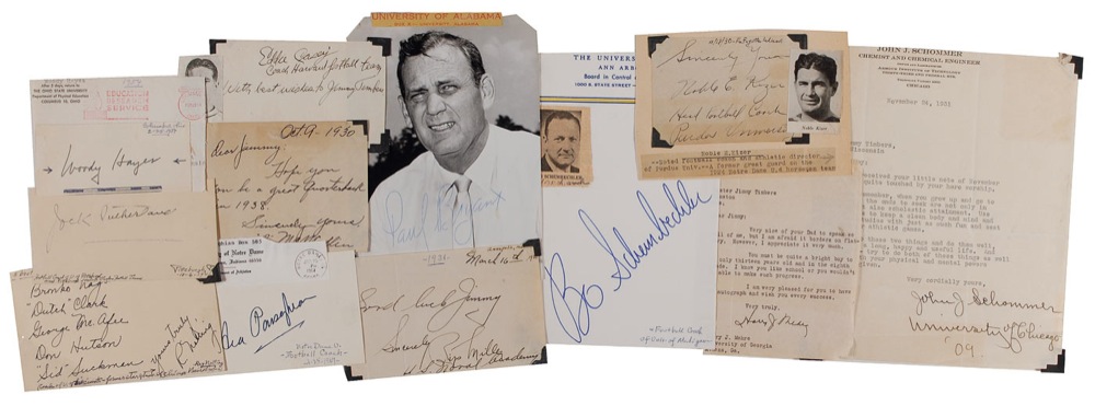 Twelve items consisting of signatures, letters, and signed photos, each signed by a different former college football coach. Signers are: Woody Hayes, Paul ‘Bear’ Bryant, Ara Parseghian, Bo Schembechler, Edgar Miller, Eddie Casey, Bo McMillin, Jock Sutherland, John Schommer, Noble Kizer, Harry Mehre, and Ray Noltling. In very good condition, with various scattered toning, trimmed edges, folds, and mounting remnants to some of the corners. RRAuction COA.