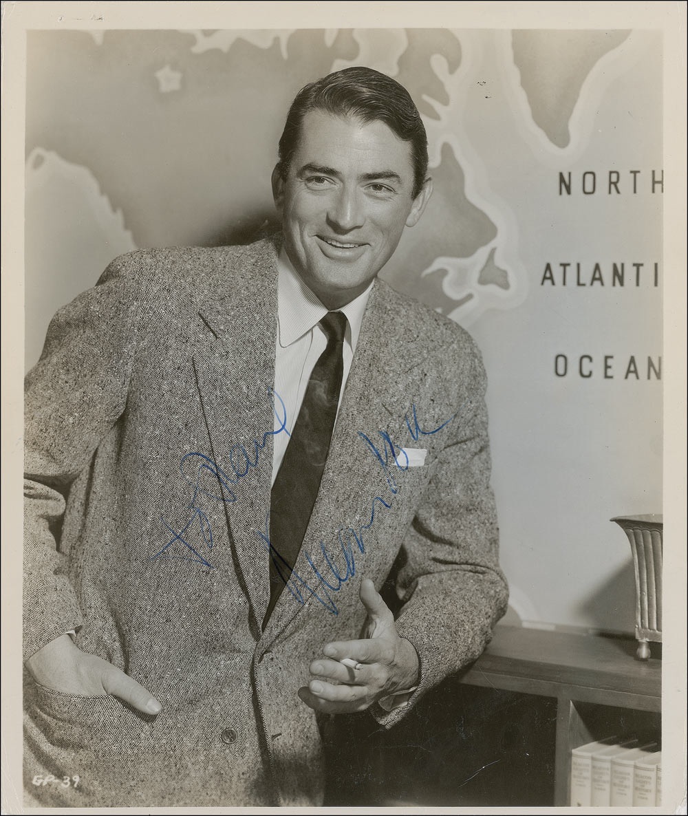 Vintage glossy 8 x 9.5 photo of the young and handsome actor, signed and inscribed in fountain pen, “To Paul, Gregory Peck.” In very good condition, with moderate surface creasing and marks, a staple hole to the top left corner, and some light contrast to the signature. Pre-certified PSA/DNA and RR Auction COA.